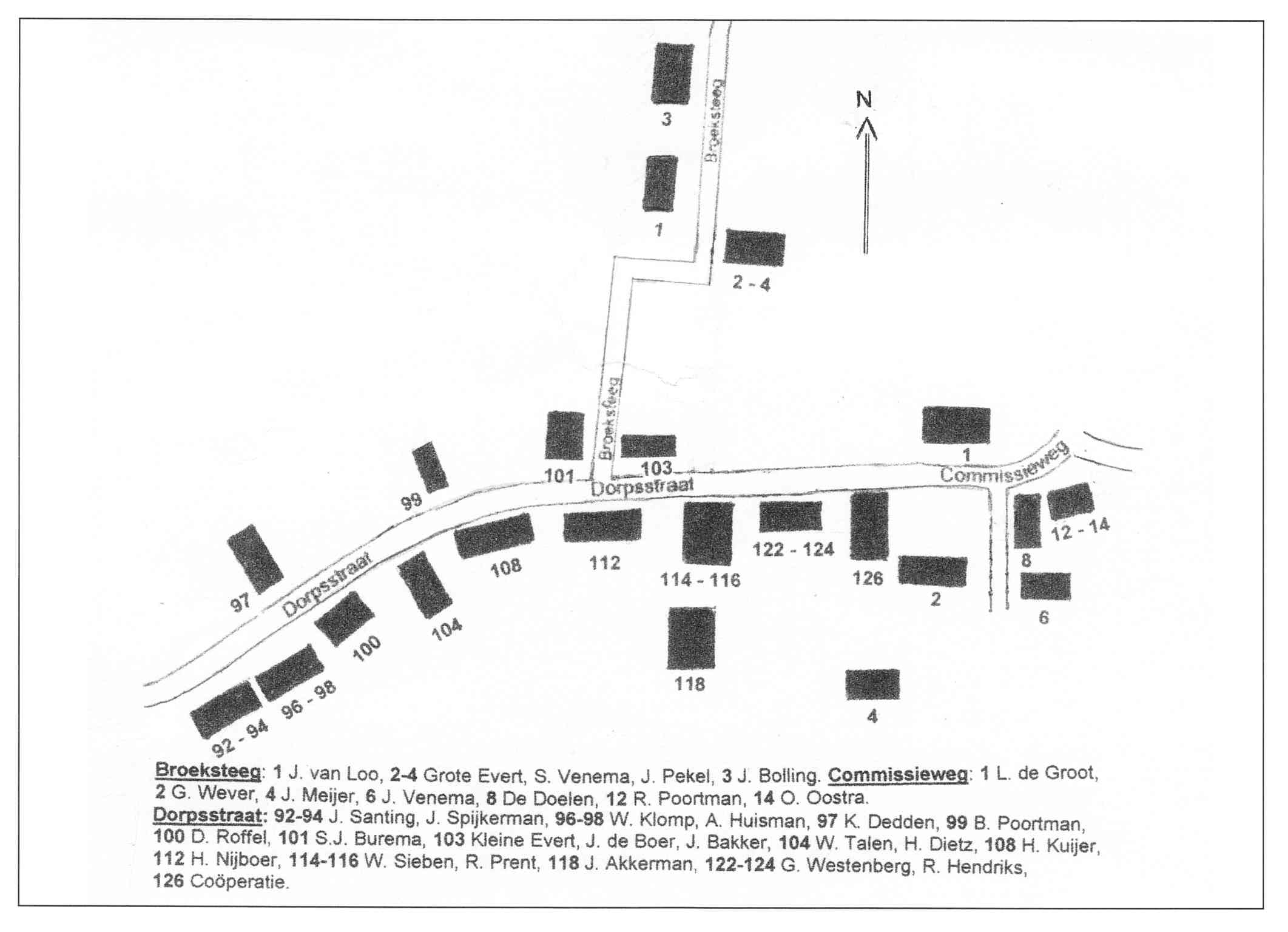 Keren we weer terug naar de Dorpsstraat. Op de plek waar nu een bungalow staat op de hoek van de Broeksteeg, stond het huis van kleine Evert. Kleine Evert was eveneens timmerman. Later woonde daar zijn dochter Jantje, die met Jan de Boer getrouwd was. Jan was huisslachter en heeft ook een tijdlang eieren ingezameld. Onder hetzelfde dak woonden Jaap Bakker en zijn vrouw Roelofje Jabben. Jaap was chauffeur bij de zuivelfabriek Haalweide en was later werkzaam bij de buitendienst van Gemeentewerken. Op het adres Commissieweg 1 woonde Lolke de Groot en later zijn dochter Roelofje, die met Hilbert Smilde was getrouwd. Lolke was melkrijder voor de zuivelfabriek Rogat. De stoomtram reed zo dicht langs dit boerderijtje dat het de machinist van de tram verboden was om daar het vuur op te stoken, omdat er gevaar bestond dat het rieten dak vlam zou vatten.