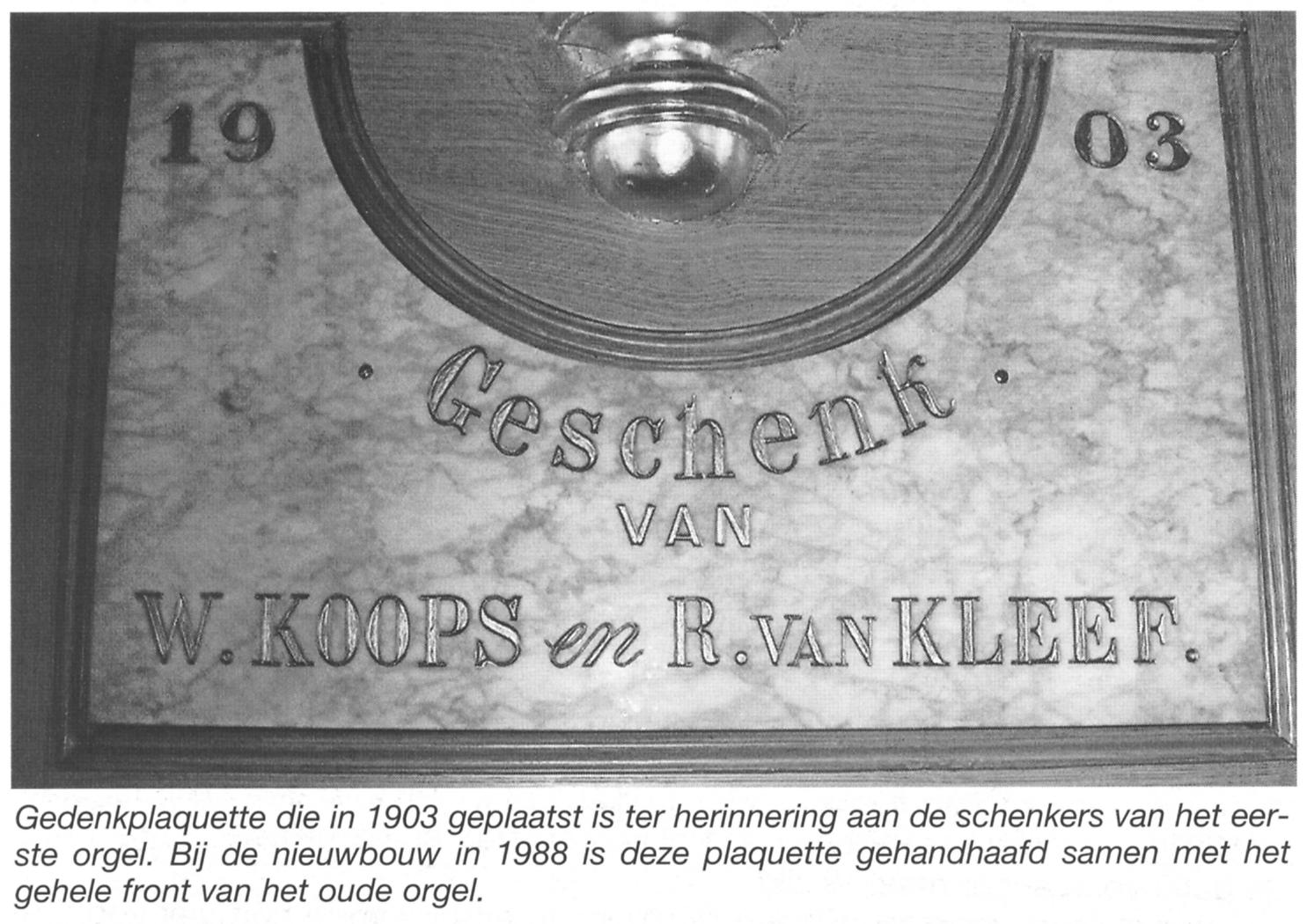 Vanuit de kerkvoogdij werd er een inzamelingsactie georganiseerd, maar ook in die tijd bleek dat er onvoldoende geldmiddelen uit de gemeenschap beschikbaar kwamen. Waarschijnlijk hebben daarom een tweetal vermogende notabelen besloten om bij te springen. In de notulen van een kerkvoogdijvergadering van 1903 wordt namelijk gewag gemaakt van een aanbod dat is binnen gekomen van de heren W. Koops en R. van Kleef, dat zij genegen zijn om een nieuw orgel te schenken aan de kerk.